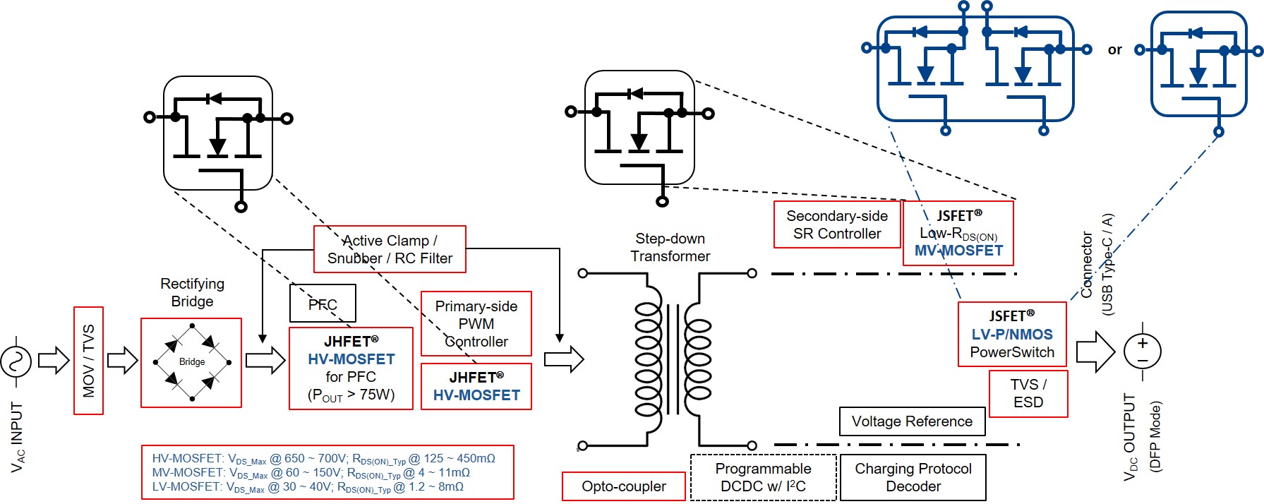 輸出功率從 18W 到 100W (甚至 120W 或更大) 、支持快充協(xié)議 (USB PD3.0/3.1, USB BC1.2, UFCS T/TAF 083-2022, Qualcomm QCxx, MediaTek PExxx、Huawei S/FCP, Oppo D/FCP, Samsung AFC, Apple 2.4A, …)、配置一個(gè)或多個(gè) USB Type-A 及 Type-C 輸出接口的快充充電器日益普遍。它們可以一物多用,同時(shí)為智能手機(jī)、平板、智能手表及筆記本電腦等萬(wàn)物互聯(lián)數(shù)字化終端里面的鋰電池快速充電。采用第三代半導(dǎo)體功率器件(氮化鎵 D/E-mode HEMT)的設(shè)計(jì),體積小巧以及使用時(shí)溫度不會(huì)燙手,由于因近年多家世界排名前列的智能手機(jī) OEM 不把充電器隨著新款手機(jī)一起標(biāo)配而形成曲棍球棒效應(yīng),使得這類(lèi)小巧的快充充電器成為市場(chǎng)主流。 市場(chǎng)上的快充充電器,常用的交直流電源轉(zhuǎn)換拓?fù)涫?Flyback 及 LLC。Flyback 拓?fù)涑R?jiàn)于功率比較小的設(shè)計(jì),LLC 拓?fù)鋭t常見(jiàn)于功率較大及對(duì)交直流電源轉(zhuǎn)換效率要求較高的設(shè)計(jì)。因?yàn)?BOM 相對(duì) LLC 拓?fù)浔容^簡(jiǎn)單,ACF-Flyback 拓?fù)湟查_(kāi)始被中/小功率的設(shè)計(jì)采用,特別是初級(jí)使用高壓氮化鎵 HEMT 的設(shè)計(jì)。無(wú)論是那種拓?fù)洌斐涑潆娖鞯膬?nèi)部結(jié)構(gòu)示意圖大概如上: 針對(duì)快充充電器的成用,捷捷微電 能提供完整的分立器件解決方案。比如,AC 輸入端防浪涌的 MOV、TVS、鉗制變壓器漏感而對(duì)原邊的高壓 MOSFETs VDS_Max 產(chǎn)生過(guò)壓的快恢復(fù)整流管、原邊 PFC (75W 以上的設(shè)計(jì)) 和匹配 PWM 的高壓 MOSFET、副邊同步整流中/低壓 MOSFETs、USB Type-A 及Type-C 端口的低壓 MOSFETs 及 ESD 保護(hù)等。
