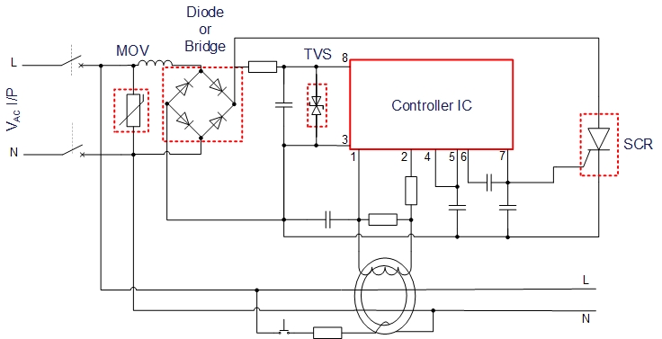 漏電保護器,簡稱漏電開關,又叫漏電斷路器,主要是用來在設備發(fā)生漏電故障時以及對有致命危險的人身觸電保護,具有過載和短路保護功能,可用來保護線路或負載的過載和短路,亦可在正常情況下作為線路的不頻繁轉(zhuǎn)換啟動之用。 目前市場上使用的漏電保護裝置種類繁多,但大體的原理都相差不大。漏電保護器主要是由三部分組成:檢測元件、中間放大環(huán)節(jié)、操作執(zhí)行機構 1. 檢測元件:由電流互感器組成,檢測漏電電流并發(fā)出信號 2. 放大環(huán)節(jié):將微弱的漏電信號放大,按裝置不同可采用機械式或電子式 3. 執(zhí)行機構:收到信號可控硅由斷開狀態(tài)變?yōu)閷顟B(tài),主線圈通電后,主開關由閉合狀態(tài)轉(zhuǎn)換為斷開狀態(tài),從而切斷電源 應用于漏電保護器領域,捷捷微電 能提供比較齊全的元件解決方案。比如:AC 輸入端防浪涌的壓敏電阻(MOV)、對交流進行整流的高壓整流二極管 (Diode) 或者是整流橋(Bridge)、對電源端進行過壓防護的瞬態(tài)抑制二極管(TVS)、整個電路的控制核心集成電路(IC)、電路動作執(zhí)行機構(SCR)等。