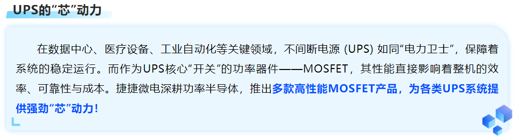 在保障關(guān)鍵設(shè)備電力安全的道路上,一顆高效、可靠的“芯”至關(guān)重要。捷捷微電持續(xù)專注于功率半導(dǎo)體技術(shù)的創(chuàng)新與突破,其UPS專用MOSFET產(chǎn)品線憑借優(yōu)異的性能參數(shù)和穩(wěn)定性,已成功應(yīng)用于各類UPS解決方案中,為客戶打造更高效、更可靠、更具成本競爭力的電源系統(tǒng)提供堅實的“芯”保障!